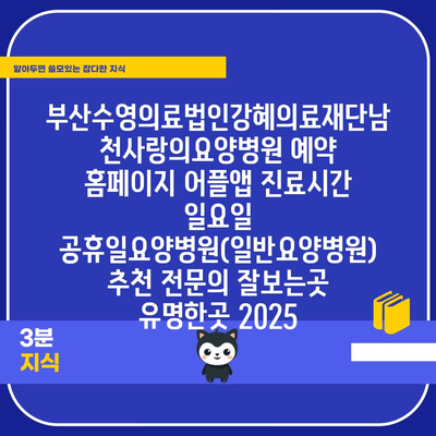 부산수영의료법인강혜의료재단남천사랑의요양병원 예약 홈페이지 어플앱 진료시간 일요일 공휴일요양병원(일반요양병원) 추천 전연락 잘보는곳 유명한곳 2025 에 대해 자주 묻는 질문 TOP 5
