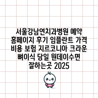 서울강남연치과병원 예약 홈페이지 후기 임플란트 가격 비용 보험 지르코니아 크라운 뼈이식 당일 원데이수면 잘하는곳 2025 에 대해 자주 묻는 질문 TOP 5
