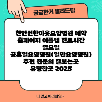 천안선한이웃요양병원 예약 홈페이지 어플앱 진료시간 일요일 공휴일요양병원(일반요양병원) 추천 전연락 잘보는곳 유명한곳 2025 에 대해 자주 묻는 질문 TOP 5